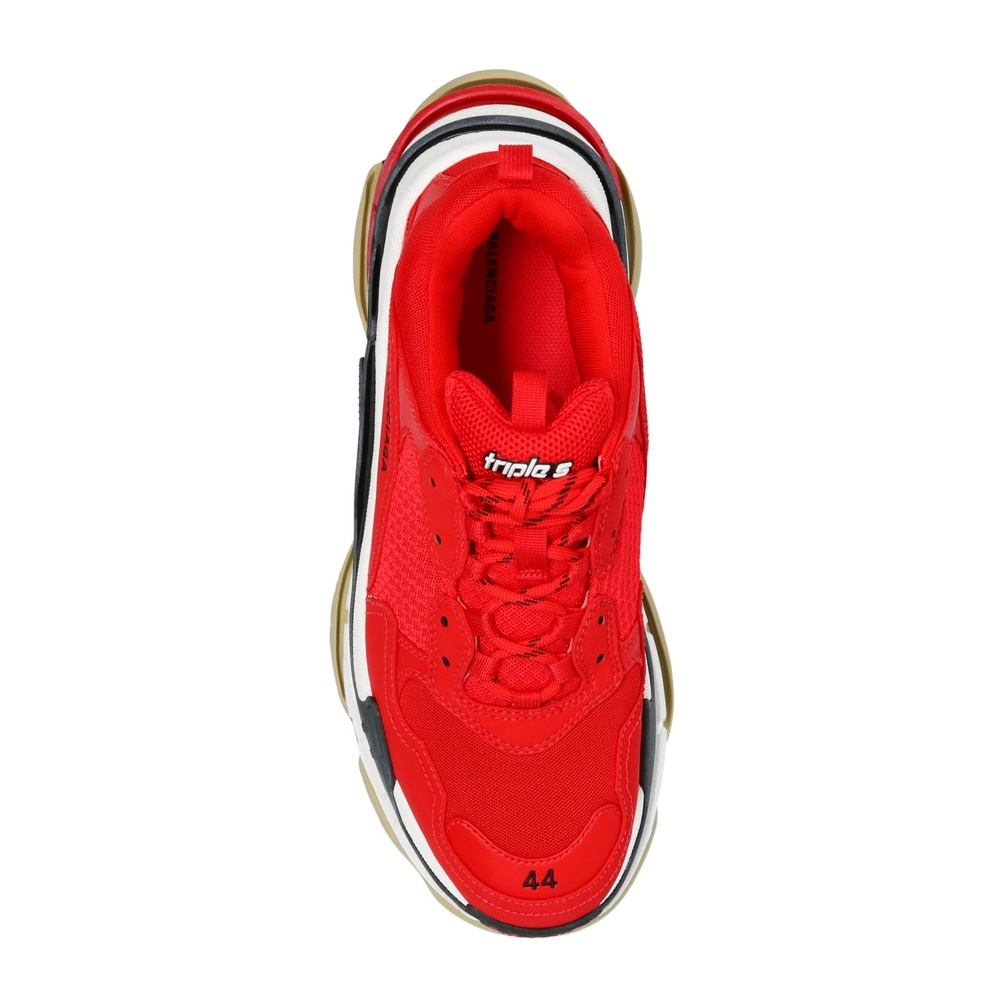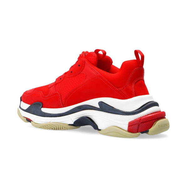 Rode, witte en zwarte ‘Triple S’ sneakers van Balenciaga. Afgezet met leren inzetstukken, heeft dit veterdesign een decoratieve applicatie op de tong, een geborduurd logopatroon in zwart en een rubberen zool in wit, rood en beige.