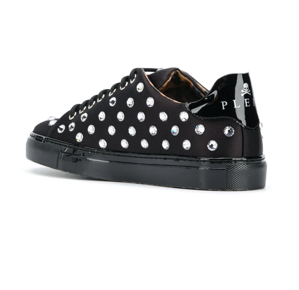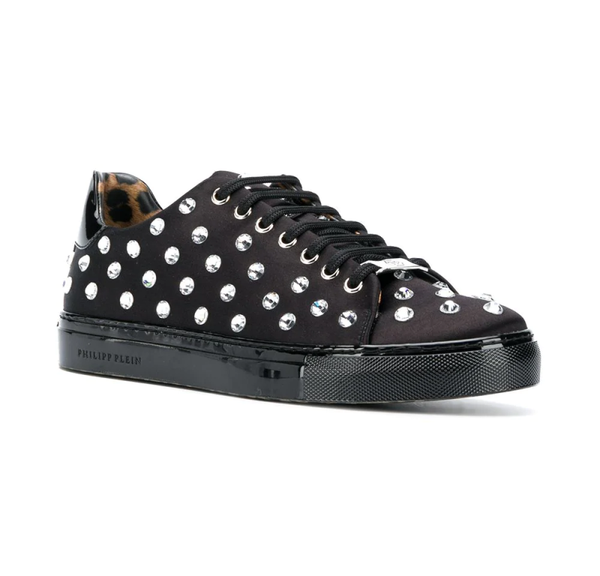 Kristallen versiering, logo plakkaat, vetersluiting aan voorkant, ronde neus en platte rubberen zool.