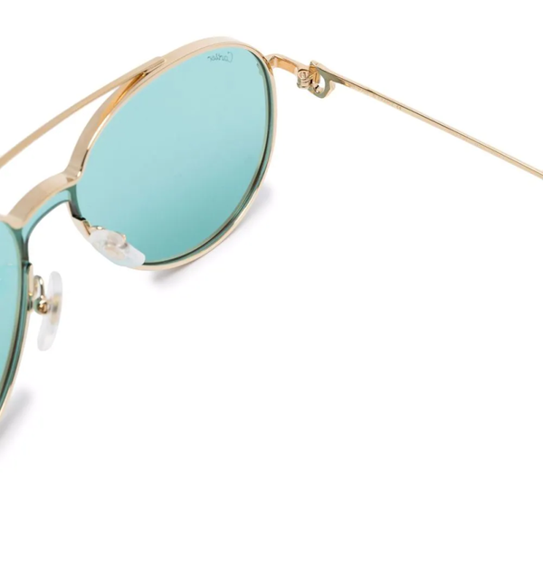 Aviator montuur, blauwe glazen, neuskussentjes, dubbele neusbrug, glazen met UV-bescherming, rechte pootjes en gebogen uiteinde. Materiaal: metaal. We weten dat je ervoor zorgt dat jouw nieuwe aankoop niets overkomt, maar voor de zekerheid zit er een beschermende hoes bij deze bril.