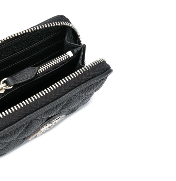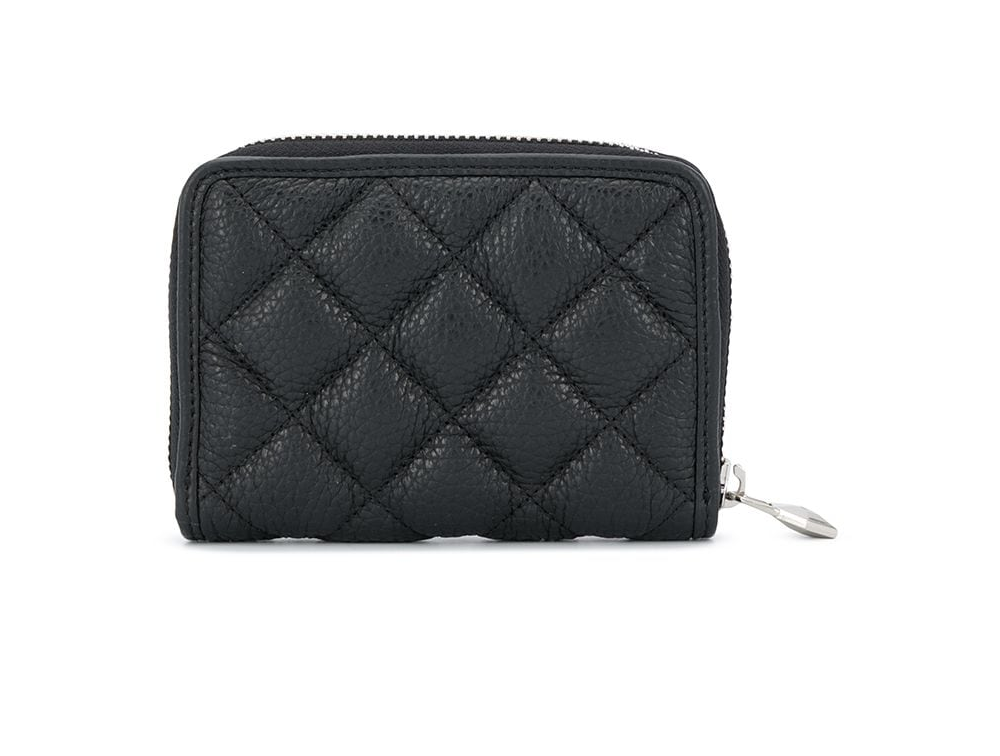Zilverkleurig materiaal, gewatteerd effect, ritssluiting, binnenzak met ritssluiting en kaartsleuven aan de binnenkant. Materiaal: leder.