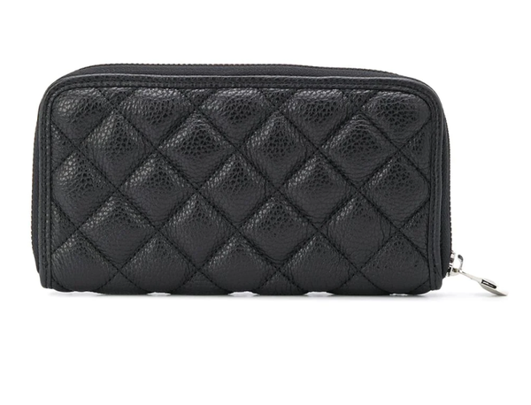 Gewatteerd effect, zilverkleurig logo , ritssluiting, binnenzak met ritssluiting en kaartsleuven aan de binnenkant. Materiaal: kalfsleer.